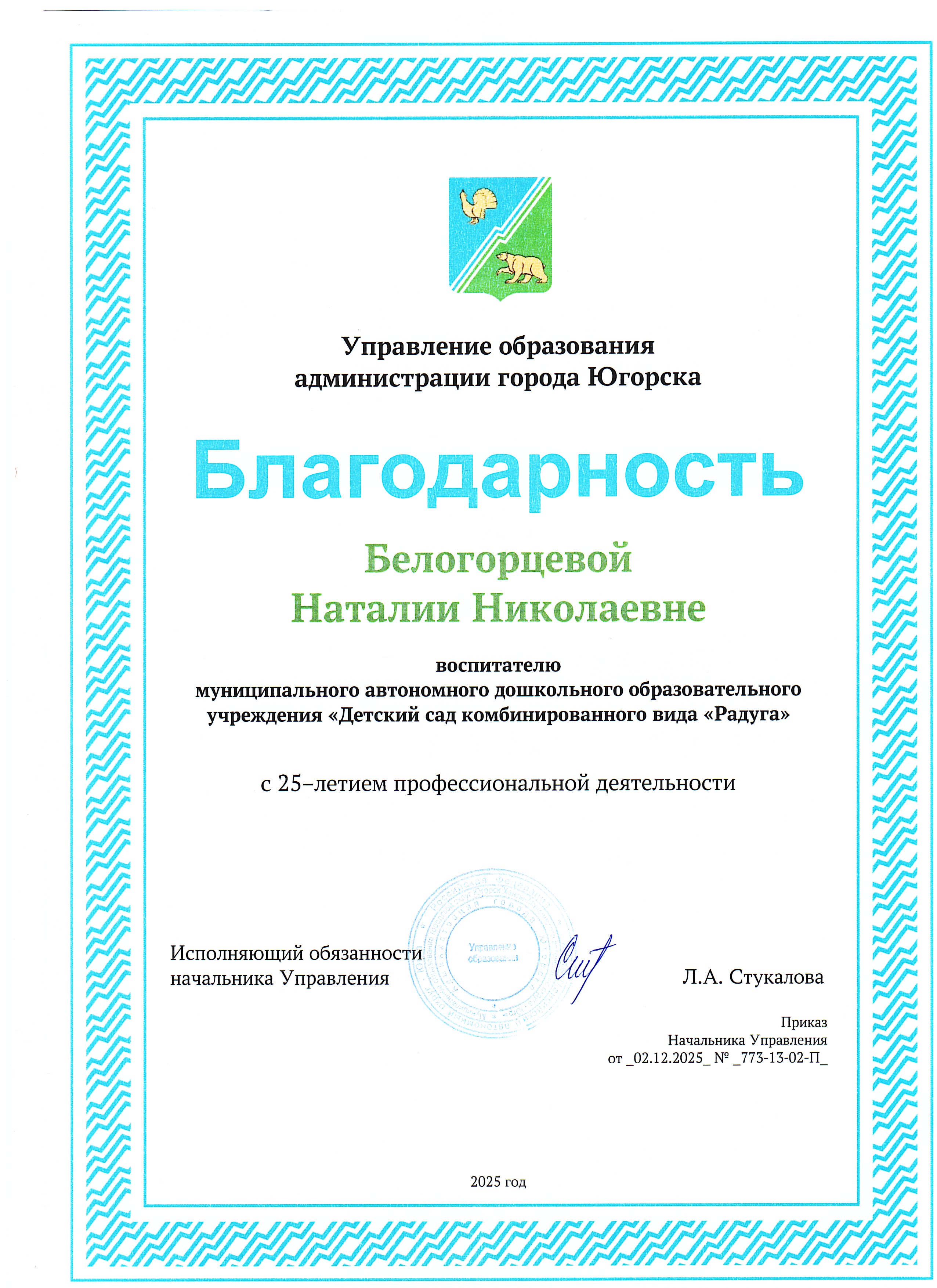 Благодарность Управления образования администрации города Югорска